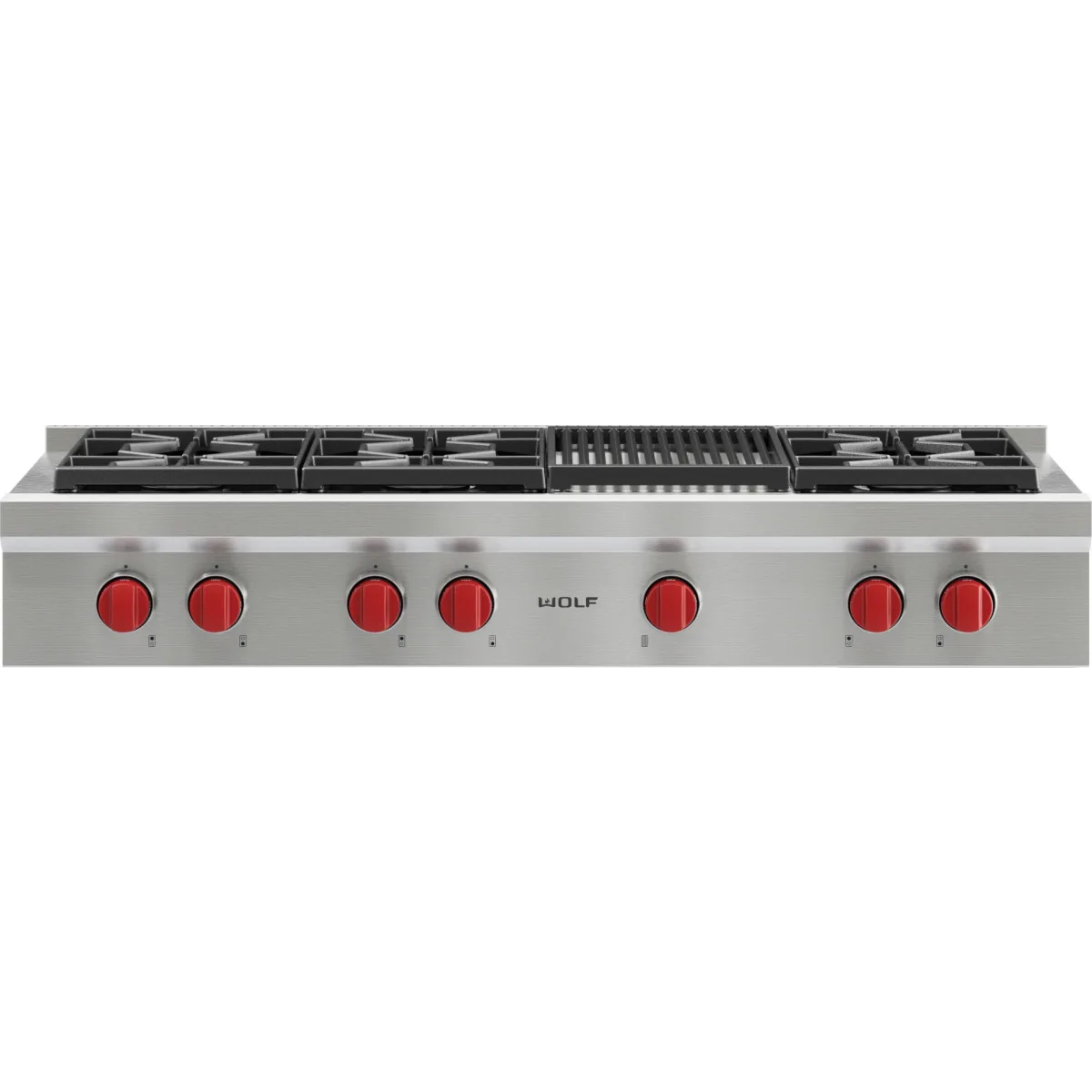 48″ Gas range-top, 6 dual-stacked sealed burners, porcelain-coated cast iron grates, Star-K, Certified sabbath mode, natural gas, stainless steel front, with red knobs